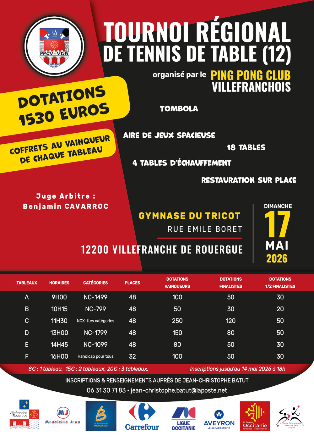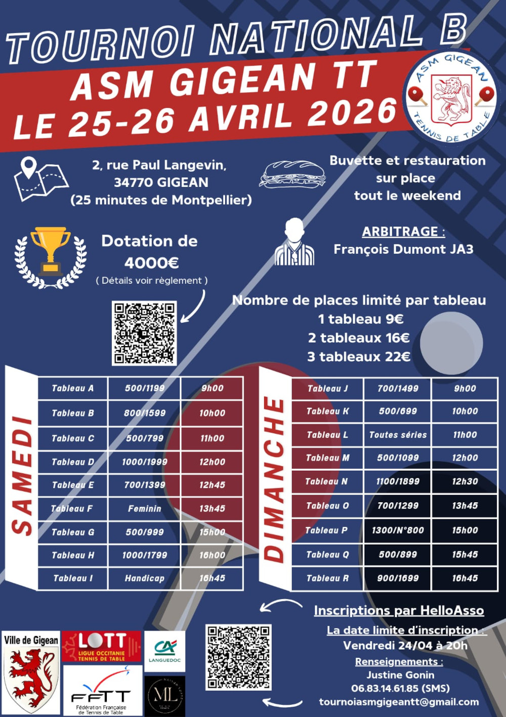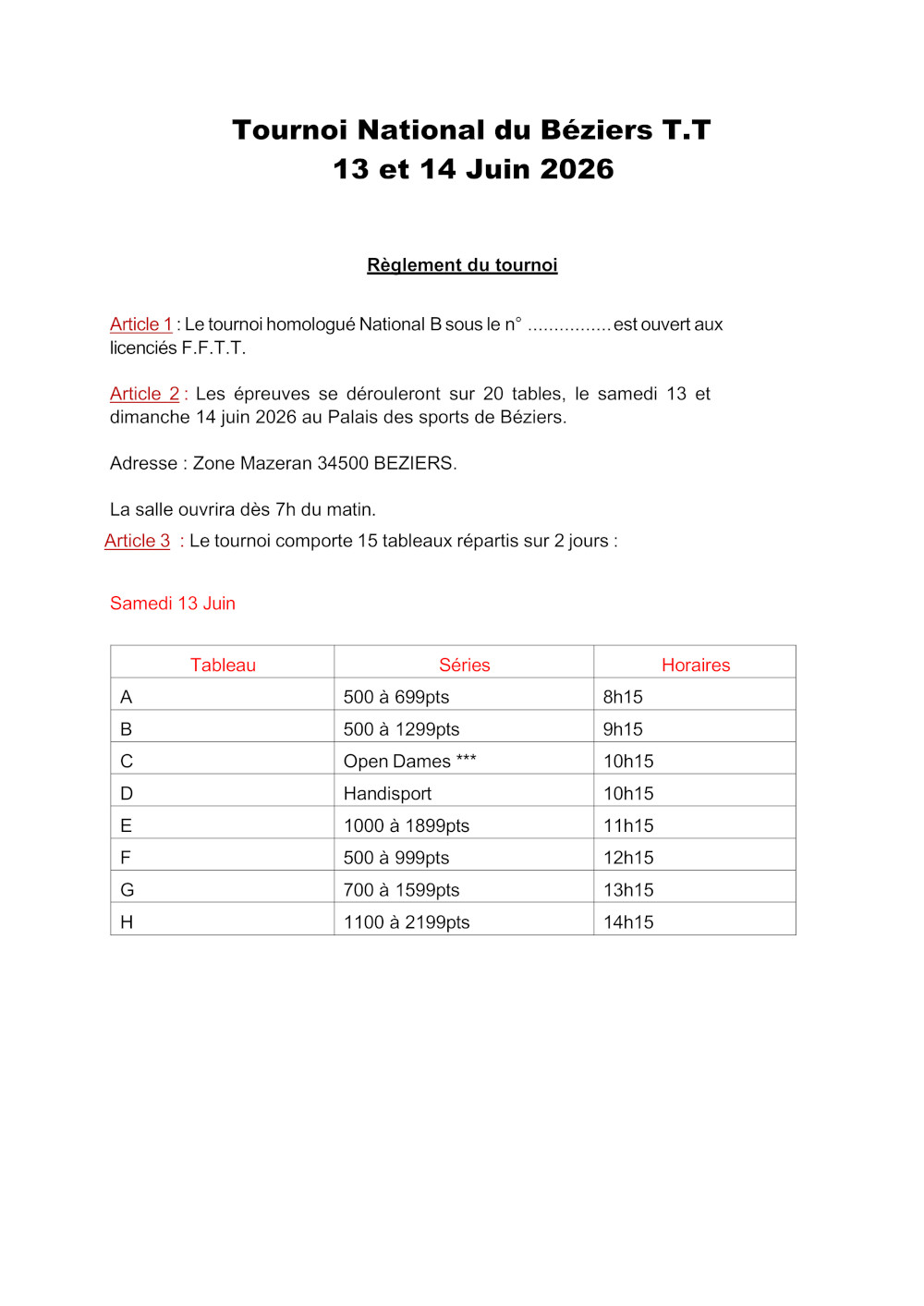 Tournois homologués Le 27juin 2026 TOURNOI REGIONAL DE L’AVENIR MURETAIN (31) INFORMATIONS Les 13 et 14 juin 2026 TOURNOI NATIONAL DE BÉZIERS (34) INFORMATIONS Le 23 mai 2026 TOURNOI NATIONAL DE PERPIGNAN RTT (66) INFORMATIONS Le 17 mai 2026 TOURNOI REGIONAL DE VILLEFRANCHE DE ROUERGUE (12) INFORMATIONS Le 8 mai 2026 TOURNOI REGIONAL DE L’ATOUT STEPHANOIS (82) INFORMATIONS Le 3 mai 2026 TOURNOI NATIONAL DE CANOHES (66) INFORMATIONS Le 1ermai 2026 TOURNOI REGIONAL DE GRAULHET (81) INFORMATIONS Les 25 et 26 avril 2026 TOURNOI NATIONAL DE GIGEAN (34) INFORMATIONS Le 5avril 2026 TOURNOI REGIONAL DE THUIR (66) INFORMATIONS Les 4 et 5 avril 2026 TOURNOI NATIONAL DE PLAISANCE DU TOUCH (31) INFORMATIONS Le 1Mars 2026 TOURNOI REGIONAL DE QUINT-FONSEGRIVES (31) INFORMATIONS Les 17 et 18Janvier2026 TOURNOI NATIONAL DE CASTELSARRASIN (82) INFORMATIONS Le 21Décembre 2025 TOURNOI NATIONAL D’ARGELES (66) INFORMATIONS Le 2Novembre 2025 TOURNOI REGIONAL DE PEROLS (34) INFORMATIONS Les 25 et 26Octobre 2025 TOURNOI NATIONAL DE FRONTON (31) INFORMATIONS Les 13 et 14 Septembre 2025 TOURNOI NATIONAL DE BRETENOUX-BIARS (46) INFORMATIONS Le 7 Septembre 2025 TOURNOI REGIONAL GRAND PRIX CONSEIL DEPARTEMENTALDU TARN (81) INFORMATIONS
